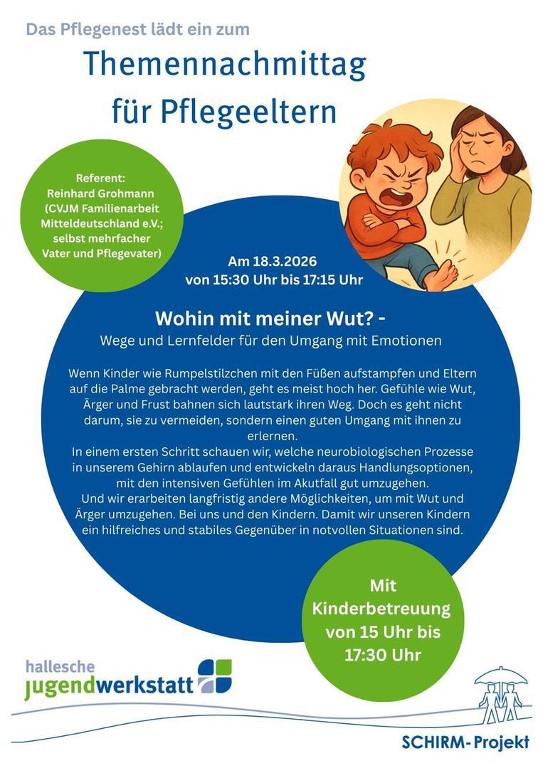 das Pflegenest Halle lädt am 18.03.2026 zum Thema "Wohin mit meiner Wut? Wege und Lernfelder für den Umgang mit Emotionen" auch "externe" Pflegefamilien ein.