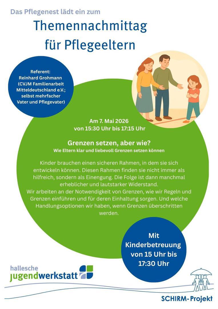 das Pflegenest Halle lädt am 07.05.2026 zum Thema "Grenzen setzen, aber wie? Wie Eltern klar und liebevoll Grenzen setzen können" auch "externe" Pflegefamilien ein.
